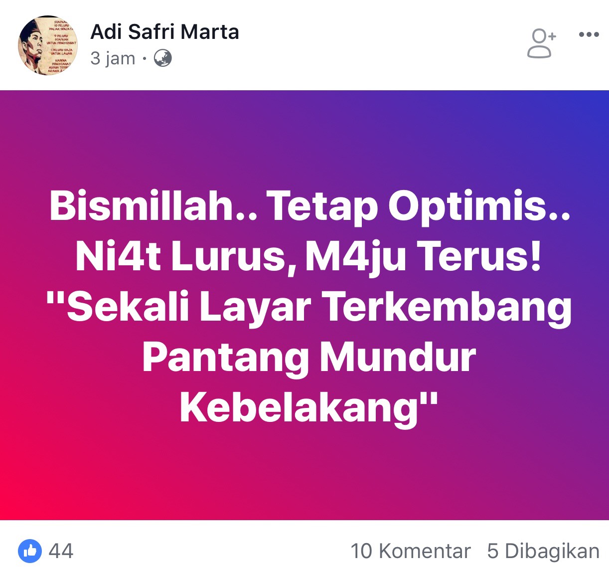 Seperti yang ditulis akun Adi Safri Marta. Ia menulis” Bismillah..Tetap Optimis.. Ni4t Lurus, M4ju Terus!” Sekali Layar Terkembang Pantang Mundur Kebelakang,”