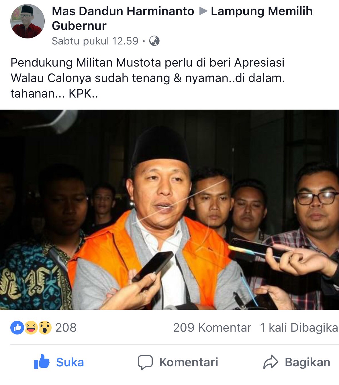 KARYANASIONAL.COM, Bandar Lampung_ Meski tersandung dugaan suap untuk menyelesaikan pembangunan infrastruktur di Lampung Tengah, dukungan terhadap calon gubernur Mustafa terus mengalir. Hastag #KamiTetapMustafaAja banjiri media sosial khususnya Facebook.
