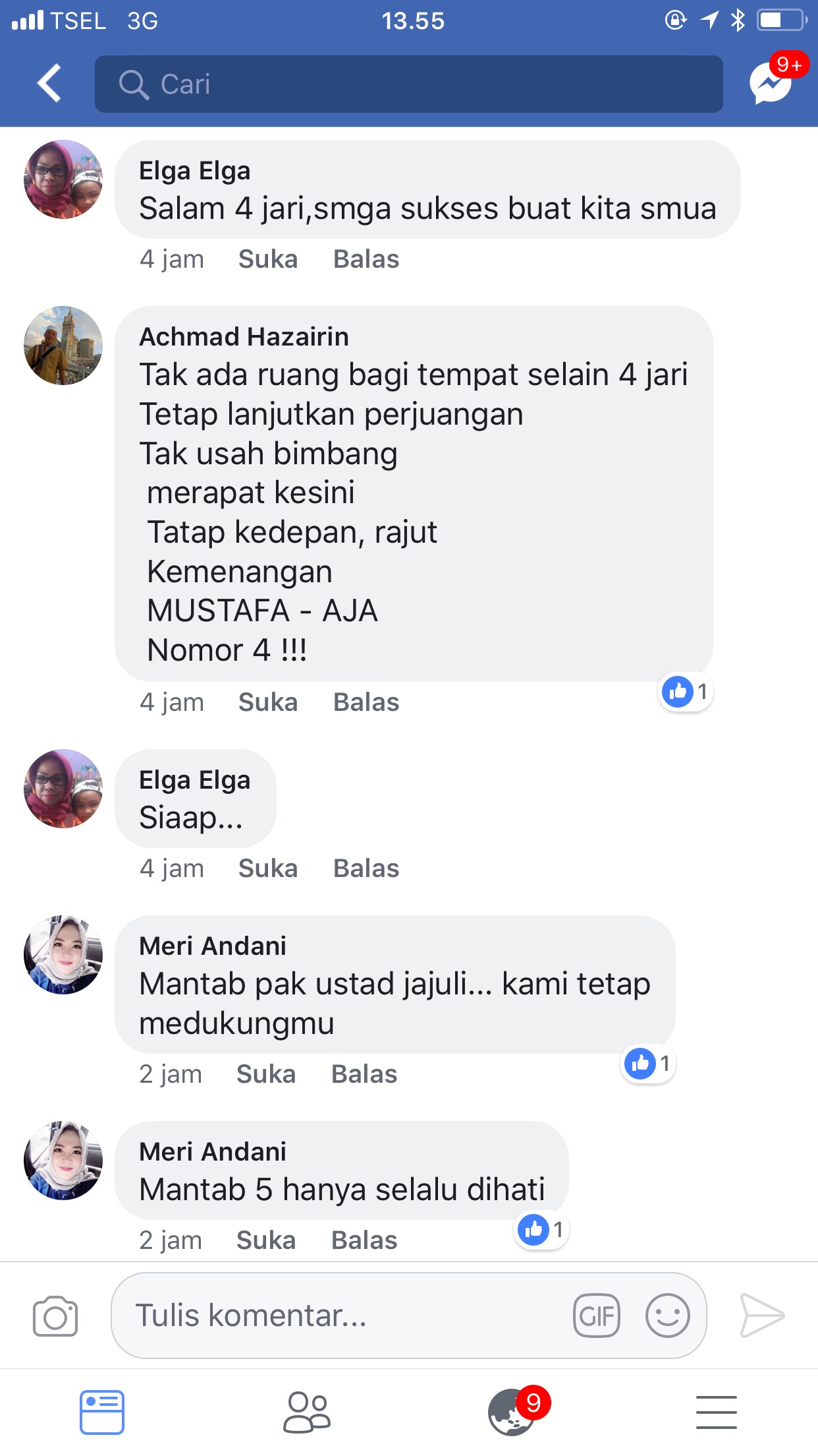 Lalu komentar dari Ahmad Huzainin,” Tak ada ruang bagi tempat selain 4 jari. Tetap lanjutkan perjuangan. Tak usah bimbang, merapat kesini. Tatap kedepan, rajut kemenangan MUSTAFA-Aja. Nomor 4!!!”