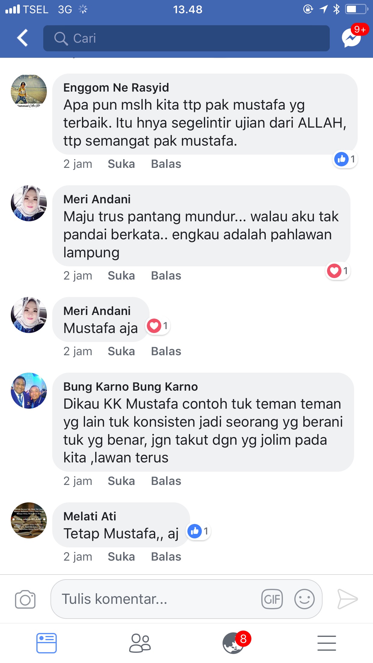 “Apapun masalah kita ttp pak mustafa yang terbaik. Itu hanya segelintir ujian dari ALLAH, ttp semangat pak mustafa”tulis Enggom Ne Rasyid.