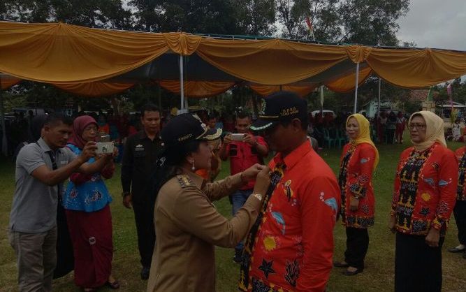 Bupati Tulang Bawang Hj Winarti SE saat menyematkan Pin kepada Sopi’i sebagai ketua Forikan Kabupaten Tulang Bawang periode 2018-2022 di lapangan Penawar rejo kecamatan Banjar Margo, selasa (15/5).