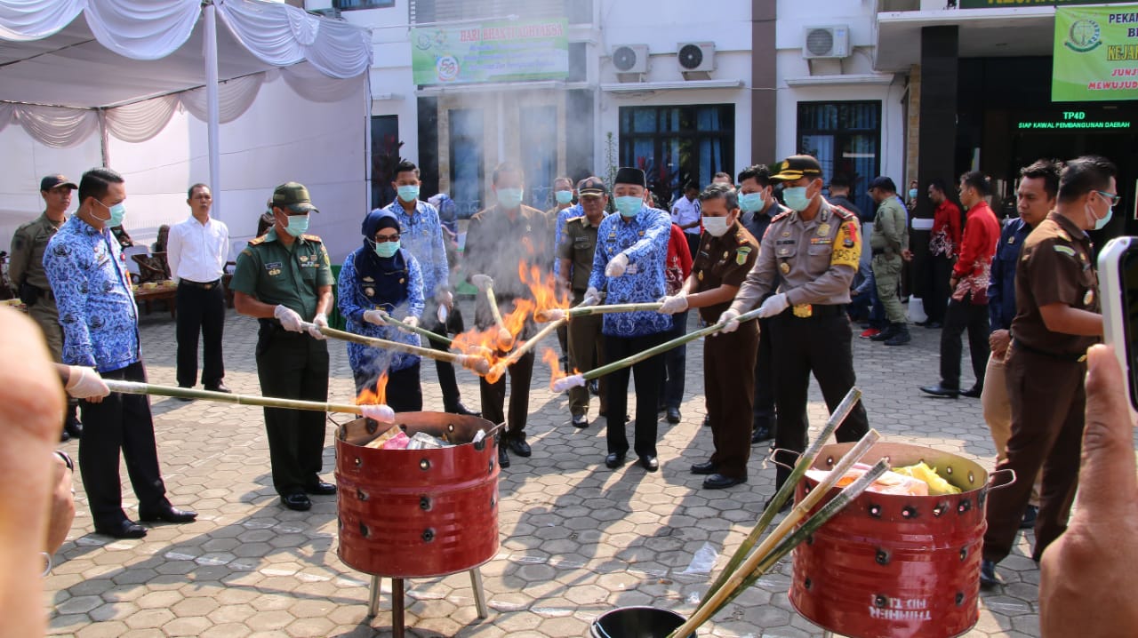 KARYANASIONAL.COM,LAMPUNG UTARA- Bupati Lampung Utara, H. Agung Ilmu Mangkunegara, hadiri pemusnahan barang bukti yang dilakukan Kejaksaan Negeri (Kejari) Kabupaten Lampung Utara, dihalaman kantor Kejaksaan setempat, Selasa (17/07/2018).