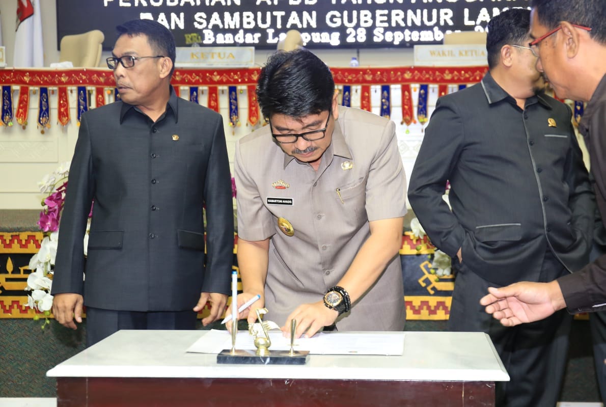 “Sidang Paripurna Pembicaraan Tingkat II ini merupakan rangkaian dalam proses penyusunan dan penetapan Raperda menjadi Perda tentang Perubahan APBD yang di mulai sejak Sidang Paripurna Pembicaraan Tingkat I dan dilanjutkan Pemandangan Umum Fraksi-Fraksi serta pembahasan di tingkat komisi yang sudah kita lalui bersama,”ujar Pj. Sekretaris Daerah Provinsi Lampung, Hamartoni Ahadis saat mewakili Gubernur Lampung Muhammad Ridho Ficardo usai melakukan penandatanganan.