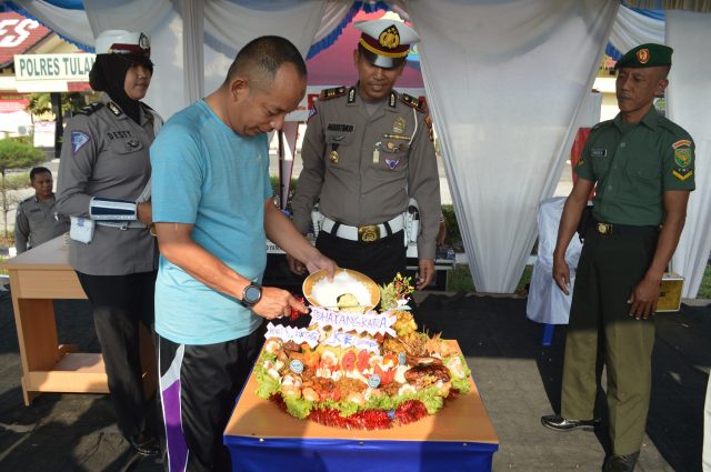 Perayaan hari jadi Polantas ke 63 di Mapolres Tulang Bawang hari ini, diawali dengan kata sambutan dari Kapolres, dilanjutkan dengan pemotongan nasi tumpeng oleh Kapolres dan diberikan kepada Kasat Lantas AKP Agustinus Rinto, SE, perwakilan dari Dinas Perhubungan, perwakilan dari Lanud Pangeran M Bunyamin, perwakilan dari Kodim 0426 Tulang Bawang, perwakilan dari Jasa Raharja, perwakilan dari Dinas Pendapatan Daerah dan perwakilan dari Kejaksaan Negeri Tulang Bawang.