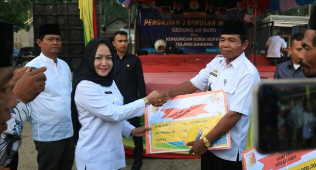 KARYANASIONAL.COM, TULANG BAWANG—Bupati Tulangbawang Winarti secara simbolis menyerahkan Dana Kampung (DK) Tahap III dan Alokasi Dana Kampung (ADK) tahap I Tahun 2018 se-Kecamatan Gedung Aji Baru, Kabupaten Tulangbawang, Rabu (10/10/2018).