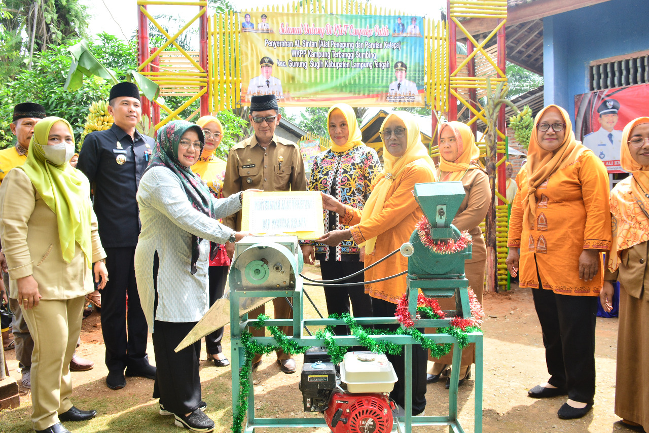 KARYANASIONAL – Ketua Tim Penggerak ( TP ) PKK Kabupaten Lampung Tengah Ny. Mardiana Musa Ahmad yang juga Ketua Umum FKWT ( Forum Kelompok Wanita Tani ) Berjaya Kabupaten Lampung Tengah menghadiri Rakor KWT Berjaya dan penyerahan alat giling tepung dan kelapa secara simbolis di Dusun V Sidorejo II Kampung Terbanggi Subing Kecamatan Gunung Sugih Lampung Tengah, Selasa (21/6/2022).