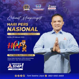 KARYANASIONAL – Ketua Fraksi Partai Demokrat DPRD Lampung Tengah (Lamteng) Toni Sastra Jaya, S.H., M.H., Mengucapkan Selamat Hari Pers Nasional (HPN) yang Ke-77 Tahun 2023, dengan mengusung tema “Pers Bebas, Demokrasi Bermartabat”.