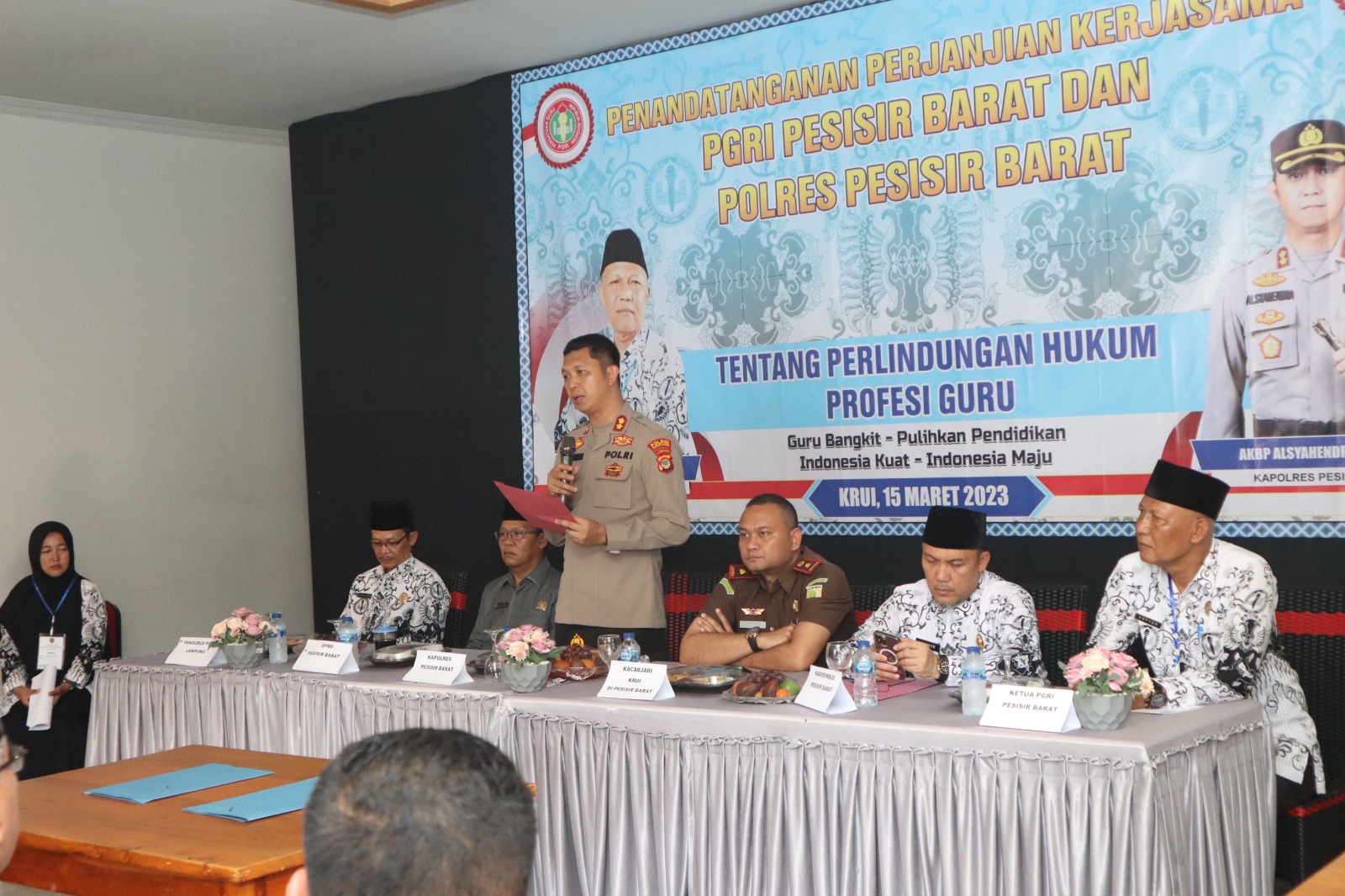 Dalam sambutannya, Kapolres Pesisir Barat AKBP Alsyahendra, S.I.K., M.H., menyampaikan beberapa pesan tentang Profesi guru adalah Noble profesion, profesi guru memiliki resiko.