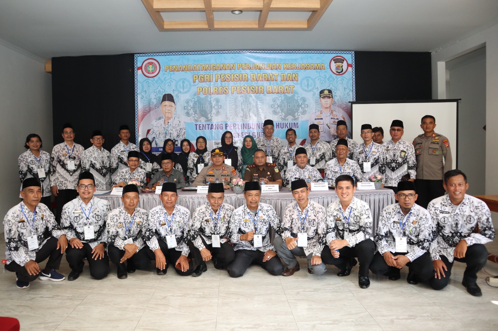 KARYANASIONAL, Pesisir Barat – Upaya meningkatkan jalinan sinergi antar instansi bersama polri, Polres Pesisir Barat (Pesibar) menggelar kegiatan Penandatanganan Naskah Perjanjian Kerja Sama (PKS) dengan Persatuan Guru Republik Indonesia (PGRI) Pesibar, tentang Perlindungan Hukum dan Bantuan Pengamanan Profesi Guru di Aula Hotel Sartika, Pekon Seray, Kecamatan Pesisir Tengah kabupaten setempat, Rabu (15/03/2023).