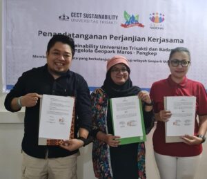Pada kesempatan ini pula Center of Enterpreneurship, Change and Third Sector ( CECT) Universitas Trisakti juga siap berkolaborasi dengan menandatangani MoU kerjasama bidang pengembangan sustainability tourism di wilayah Geopark Maros Pangkep. Penandatangan dilakukan langsung oleh Direktur CECT Trisakti Dr Maria Utha didampingi Tin CECT Rio Widyandaru di Makassar.