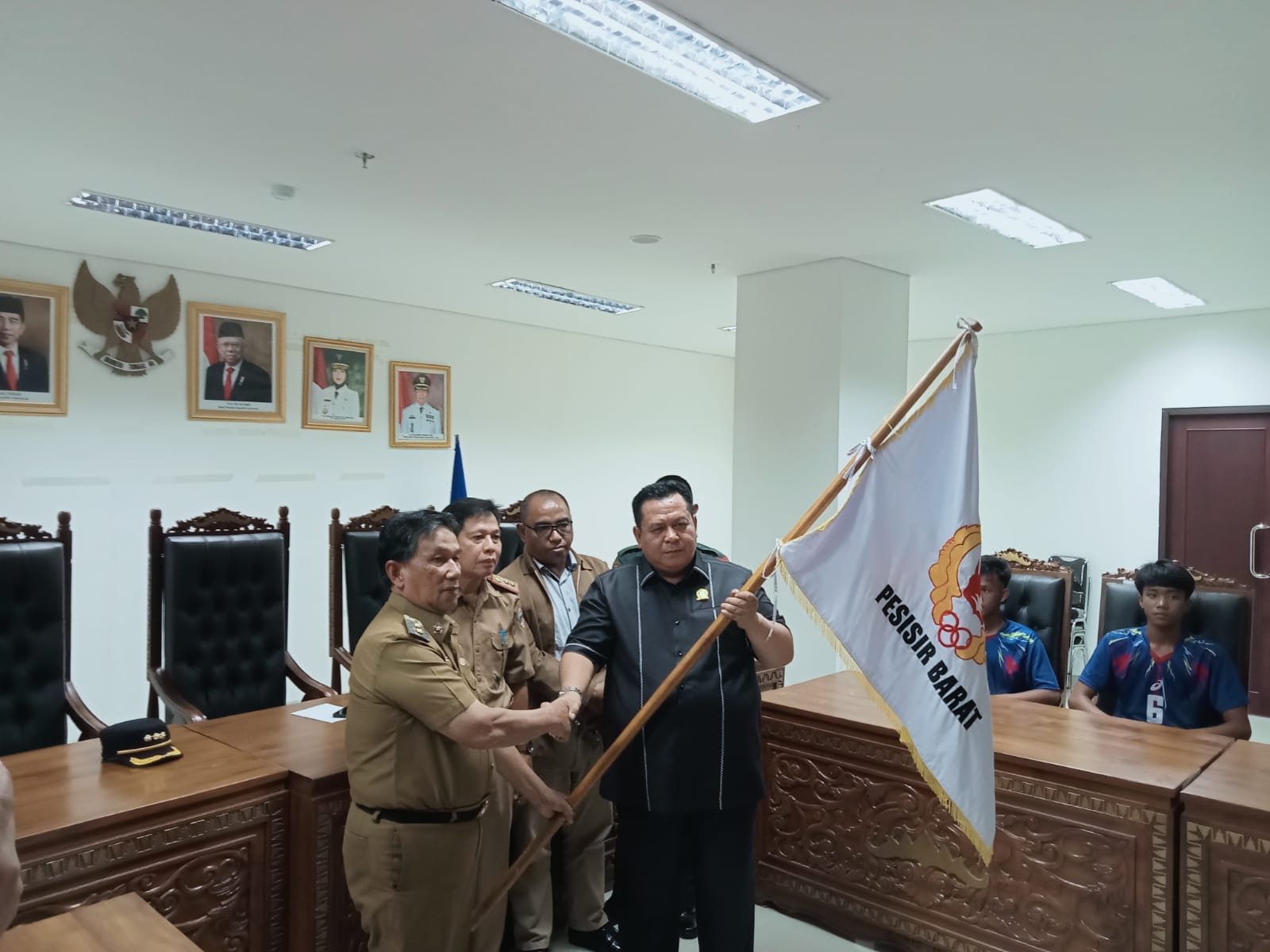 KARYANASIONAL, Pesisir Barat – Bupati Pesisir Barat (Pesibar) Dr. Drs. Agus Istiqlal, S.H., M.H.  yang dalam hal  ini  diwakili  oleh  Wakil  Bupati     Pesisir Barat,  A. Zulqoini Syarif, S.H.   melepas    12 Atlet Bola Volly dari Kabupaten Pesisir Barat bertempat  di Ruang  Rapat Bupati, Gedung A Lantai 4,  Komplek   Perkantoran   Pemkab Pesisir Barat, Senin (29/5/2023).