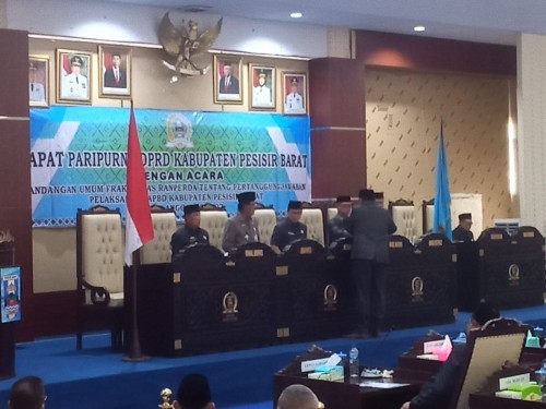 KARYANASIONAL, Pesisir Barat – Bupati – Wakil Bupati Pesisir Barat (Pesibar), Dr. Drs. Agus Istiqlal, S.H., M.H., – A. Zulqoini Syarif, S.H., menghadiri Rapat Paripurna Dewan Perwakilan Rakyat Daerah (DPRD) Pesibar dengan agenda persetujuan Rancangan Peraturan Daerah (Ranperda) tentang pertanggung jawaban pelaksanaan Anggaran Pendapatan Belanja Daerah (APBD) Tahun Anggaran 2022, di ruang rapat DPRD Pesibar, Senin (10/07/2023).