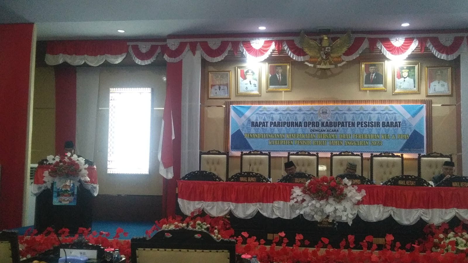 Bupati-Wakil Bupati Pesisir Barat (Pesibar), Dr. Drs. Agus Istiqlal, S.H., M.H., – A. Zulqoini Syarif, S.H., menghadiri rapat paripurna Dewan Perwakilan Rakyat Daerah (DPRD) Pesibar dengan agenda penandatanganan nota kesepakatan Perubahan Kebijakan Umum Anggaran – Prioritas Plafon Anggaran Sementara (KUA-PPAS) Anggaran Pendapatan dan Belanja Daerah (APBD) Tahun Anggaran 2023, di ruang paripurna DPRD Pesibar, Jumat 18 Agustus 2023.