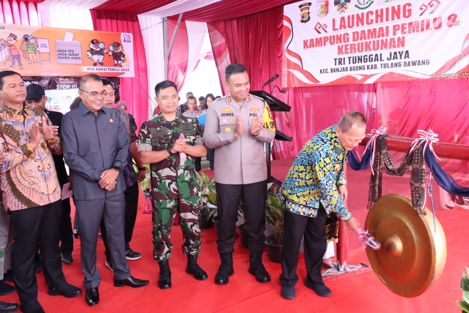 “Kampung Damai Pemilu yang kita launcing hari ini, merupakan yang pertama di Provinsi Lampung dan Kabupaten Tulang Bawang, juga sebagai bentuk cooling system guna menciptakan situasi Pemilu yang aman dan damai,” kata AKBP James.