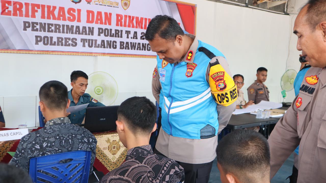 Hal tersebut disampaikan oleh Kapolres kepada seluruh calon siswa (casis) dengan didampingi Kabag SDM, Kompol Yaya Karyadi, S.Ag, M.Si, pengawas internal dan eksternal, saat melihat secara langsung proses verifikasi dan pemeriksaan administrasi (rikmin) awal penerimaan Polri TA 2024 Polres Tulang Bawang, Senin (22/04/2024) siang.