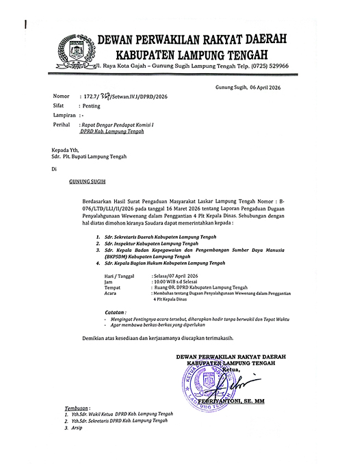 Dalam surat bernomor 172.7/367/Setwan.lV.l/DPRD/2026 itu, Komisi l DPRD Lamteng meminta Plt. Bupati I Komang Koheri memerintahkan, Sekda, lnspektur, Plt. Kepala BKSDM, dan Kabag Hukum Pemkab Lamteng, untuk hadir dalam rapat dengar pendapat bersama Komisi l DPRD Lampung Tengah, guna membahas dugaan penyalahgunaan wewenang pergantian 4 Plt. Kepala Dinas/Badan dilingkup Pemkab setempat beberapa waktu lalu.